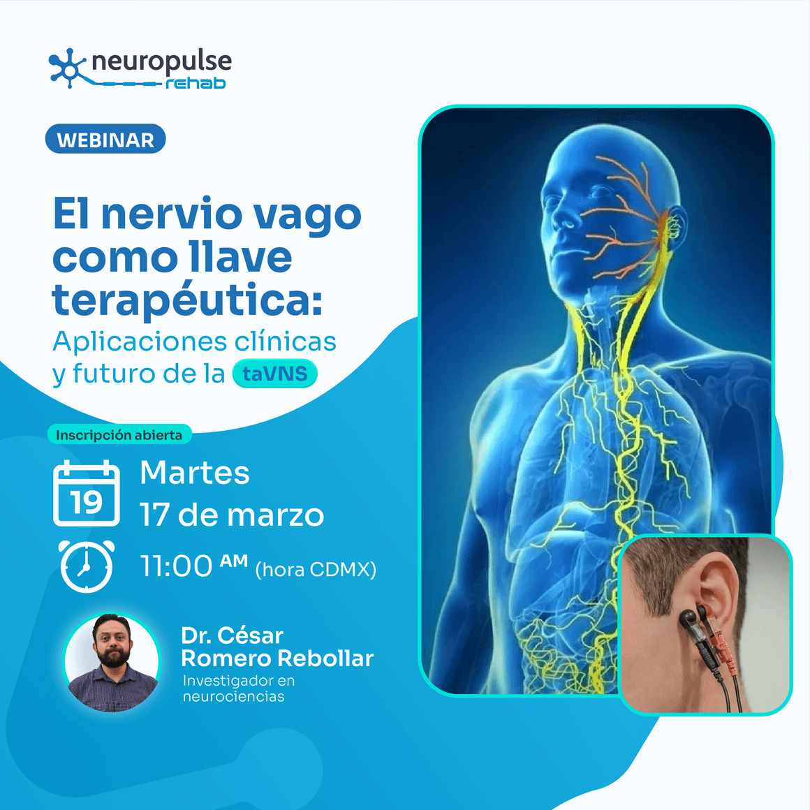 En este webinar exploraremos el papel del nervio vago como modulador clave del sistema nervioso autónomo y su relevancia terapéutica a través de la taVNS (estimulación transcutánea del nervio vago). Revisaremos fundamentos fisiológicos, aplicaciones clínicas actuales y el panorama futuro de esta tecnología dentro de la práctica profesional.